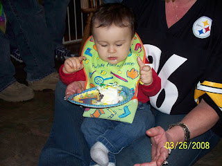 Sooo... Hayden is finally 1. It makes me really sad to think that he is growing up soooo fast. I cried today about it after Patty left, but I know that it has to happen. Ok about the big day... It was a pretty busy day for the little man. We went to town to get his balloons and a few last minute things for the party and took him out to eat. Then we came home and tried to get him to take a nap before the party started and he wanted no part of it. I think that he knew that something was up. Mom and Patty got there early and thank goodness they did bc they were the ones that had to decorate, poor things. It was now time for the party. My neighbors brought over their 2 kids and Hayden played a little with them. We of course got Hayden his own little cake so that he could just dig in and well that didn't happen. He did not want to use his hands that much. He preferred using the fork, but that was ok. Kylie helped Hayden open his gifts, bc he was more interested in playin with the ones that were already opened.